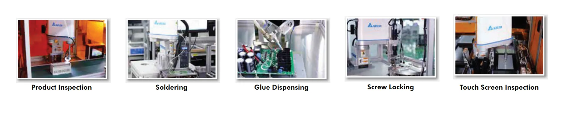 Insertion, screw locking, assembly, glue dispensing, coating, soldering, load and unload, pick-and-place, stacking, packaging, and inspection